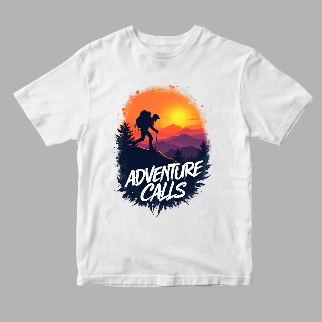 The LIGERONE Adventure Calls Hiking T-Shirt is designed for those who believe the mountains are calling. The design captures a determined adventurer trekking through rugged landscapes beneath a glowing sunset sky.