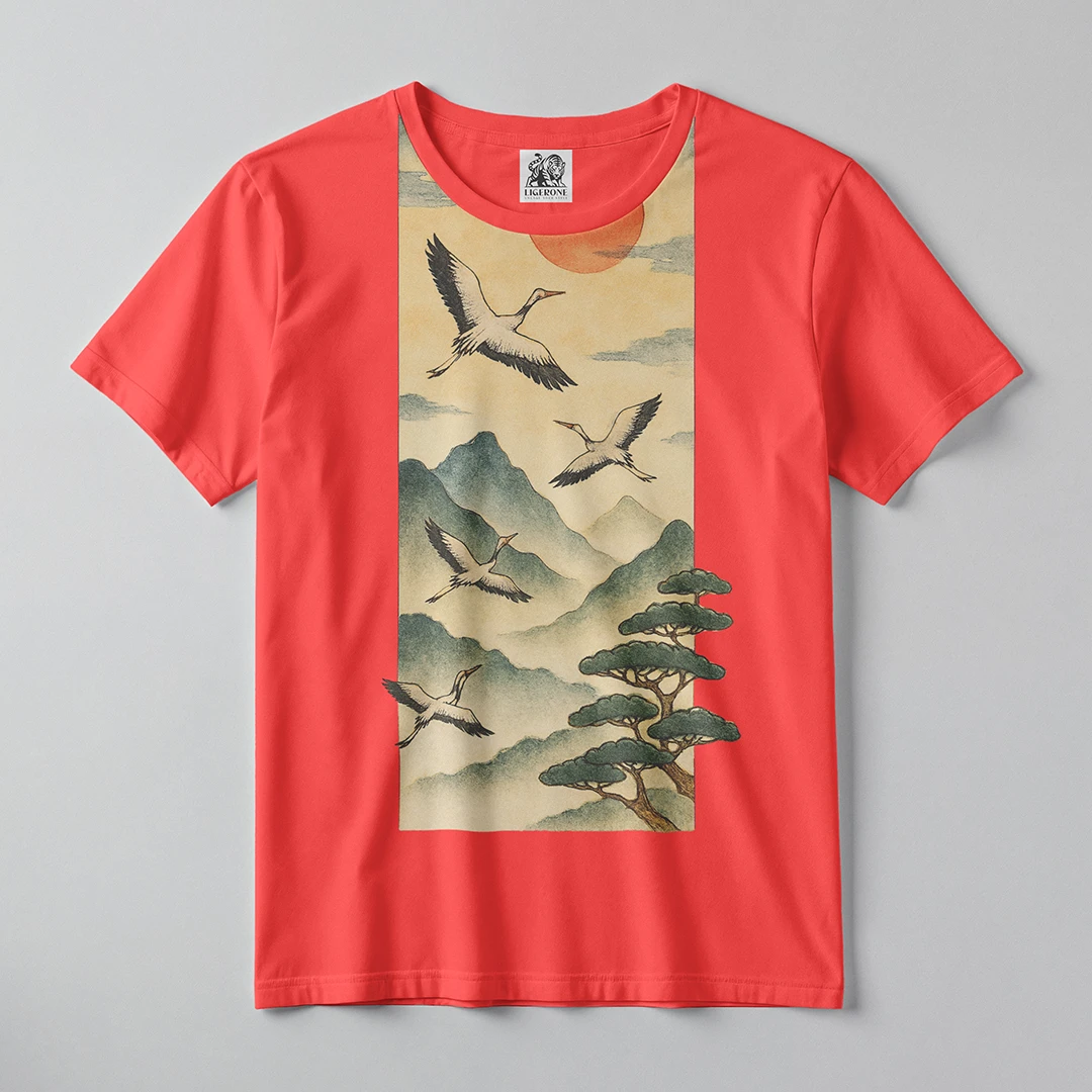 The LIGERONE Japanese Crane Mountain Graphic T-Shirt brings traditional Eastern aesthetics into modern street fashion. This artistic design features graceful cranes soaring above misty mountains and a rising red sun, symbolizing peace, freedom, and harmony.
