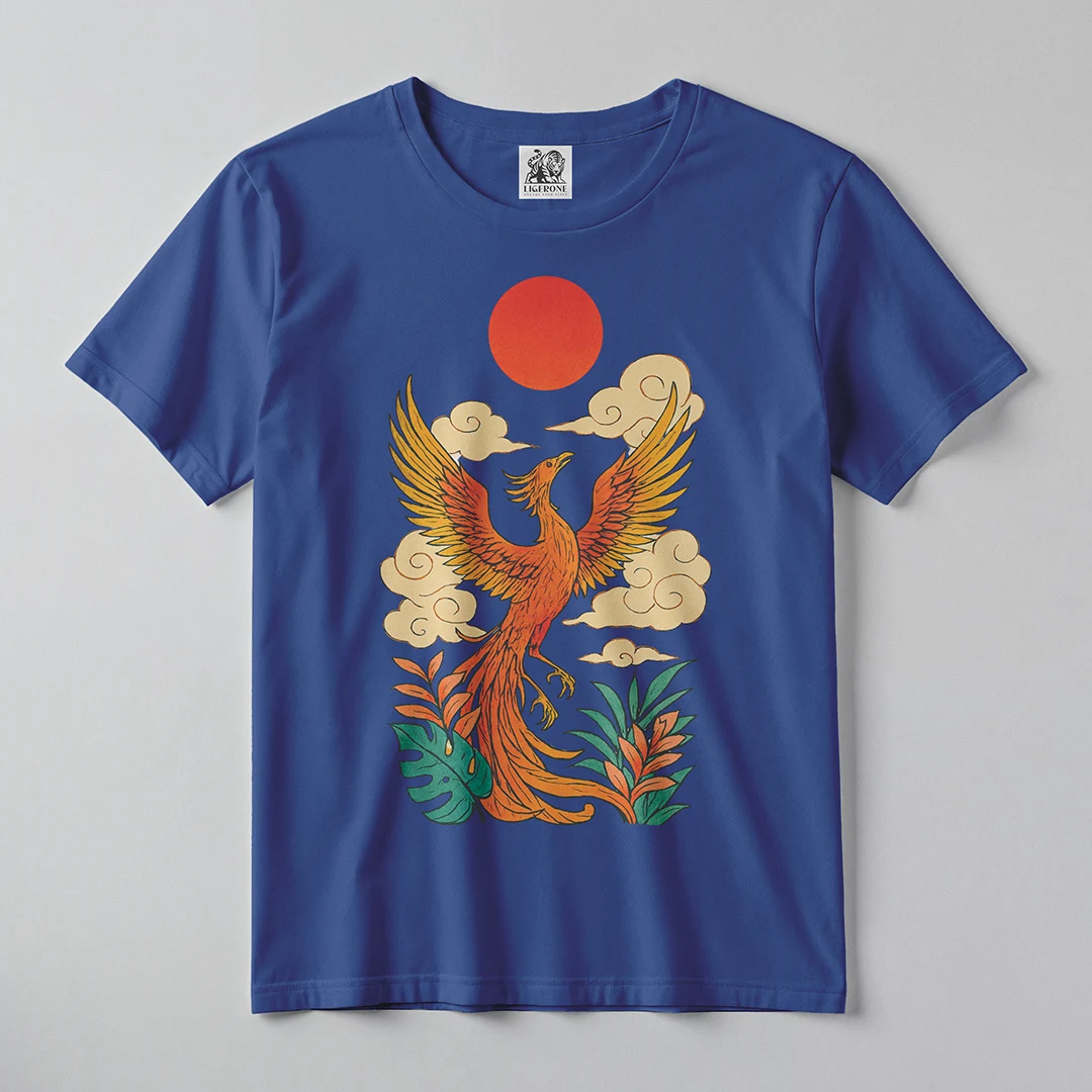 The LIGERONE Phoenix Rising Graphic T-Shirt symbolizes rebirth, strength, and unstoppable spirit. The detailed phoenix artwork spreads its fiery wings across a dramatic sky filled with clouds and warm sunset tones.